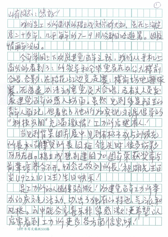 發布時間: 2021-08-20 點擊數量:2013“以人性化服務和溫情服務為宗旨,努力做到讓老同志方便、放心、滿意,感受到家人般的溫暖”,這是離退休辦公室的服務宗旨。近日,一封感謝信從遠在上海定居的老同志寄來,信里表達了對工力所在建黨百年之際取得的成績感到驕傲和自豪,重點感謝了離退辦同志對異地居住和就醫的老同志給予生活上和就醫方面的關心和幫助。他飽含感激之情地講述了幾件事,他說“我們講述幾件個人小事,但能說明工力所不單培養科技人才,為民辦事一般工作人員也是稱職的。”“全心全意為人民服務的精神傳遞了黨和政府對老年人的關愛”……老同志口中的小事都是我們為群眾服務的大事,我們要為群眾辦真事、真辦事。