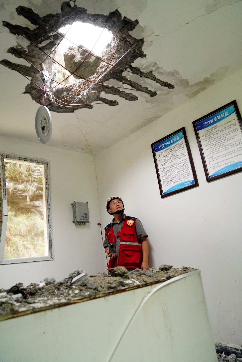 石棉線科考組圍繞石棉川02井、擦羅強震臺站、栗子坪強震臺站開展了周邊建筑震害調(diào)查。該區(qū)域儀器烈度與實際建筑破壞程度基本相符,考察區(qū)域的大部分震害為非結(jié)構(gòu)構(gòu)件的破壞,如框架結(jié)構(gòu)填充墻開裂、瓷磚脫落等。科考組考察到的2008年汶川地震后援建的中小學校舍在此次地震中表現(xiàn)良好,幾無震害。個別房屋出現(xiàn)了屋蓋和墻壁被落石直接擊穿的震害。
