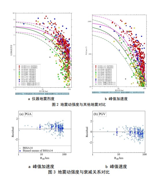 對比分析了此次地震的地震動參數(shù)(儀器地震烈度、峰值加速度PGA和峰值速度PGV)與我國2015版地震動參數(shù)區(qū)劃圖地震動衰減關系的估計值、2022年四川瀘定6.8級地震、2021年云南漾濞6.4級地震的地震動參數(shù)差別(見圖2)。整體上,儀器地震烈度和峰值加速度明顯高于2015版地震動參數(shù)區(qū)劃圖中地震動衰減關系的估計值;此次地震的地震動與震級更大的瀘定6.8級地震的地震動較為接近,明顯大于漾濞6.4級地震的地震動。對比地震動參數(shù)與美國NGA-West 2 衰減關系(見圖3),峰值加速度高于NGA-West 2衰減關系中位值,峰值速度與衰減關系中位值較為接近,表明此次地震地震動的高頻能量顯著。