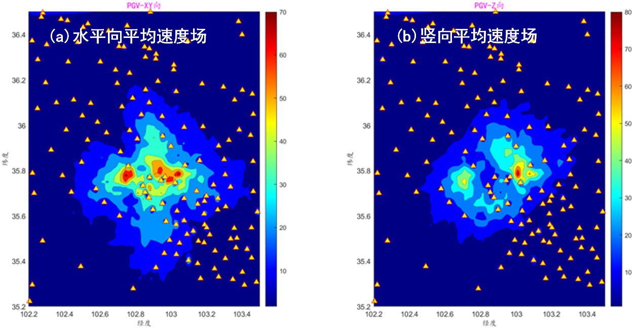 進一步,我們結(jié)合震源反演初步結(jié)果,采用USTClitho2.0公共波速結(jié)構(gòu)模型(見圖5)和確定性地震動模擬技術(shù),初步再現(xiàn)地震動場的時空發(fā)育過程。我們采用了歷史統(tǒng)計得到的破裂時間過程函數(shù),同時考慮了此次地震應力降高的特性。圖6給出了模擬的水平向和豎向峰值速度空間分布。從模擬結(jié)果可以看出,盡管沒有考慮地表土體對地面運動速度的放大作用,模擬值偏低,但模擬結(jié)果與烈度儀實測峰值速度場大致吻合。為此,進一步確定了發(fā)震震源的高應力降是造成此次地震記錄高異常峰值普遍存在的主要原因。