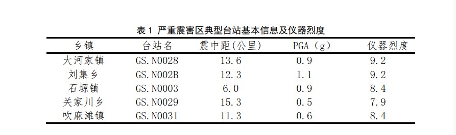 根據(jù)現(xiàn)場調(diào)查情況,大河家鎮(zhèn)、劉集鄉(xiāng)、石塬鎮(zhèn)、關家川鄉(xiāng)、吹麻灘鎮(zhèn)等鄉(xiāng)鎮(zhèn)震害嚴重。對此,我們對以上鄉(xiāng)鎮(zhèn)附近的強震動記錄進行了分析。首先,由儀器烈度分布圖(如圖7)可知,上述鄉(xiāng)鎮(zhèn)均位于高儀器地震烈度區(qū)(見表1)。