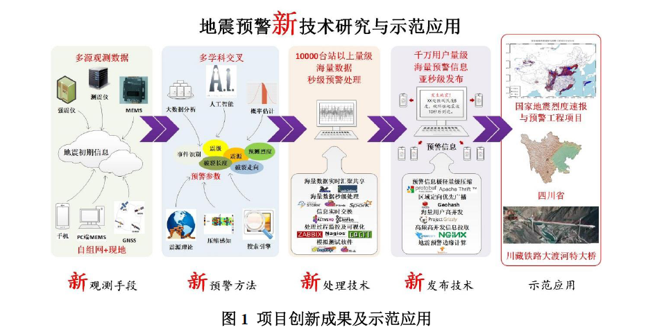 項(xiàng)目緊緊圍繞國家重大建設(shè)項(xiàng)目“國家地震烈度速報(bào)與預(yù)警工程”實(shí)施中亟待解決的關(guān)鍵科技問題,針對(duì)確定地震預(yù)警參數(shù)的“快和準(zhǔn)”問題和地震預(yù)警系統(tǒng)建設(shè)的技術(shù)需求,按照“理論研究—技術(shù)研發(fā)—系統(tǒng)研制—示范應(yīng)用”的一體化實(shí)施路線,基于人工智能、大數(shù)據(jù)分析等先進(jìn)新興技術(shù),通過3年多的科研攻關(guān),實(shí)現(xiàn)了“新觀測手段、新預(yù)警方法、新處理技術(shù)、新發(fā)布技術(shù)”的“四新”創(chuàng)新點(diǎn),并在四川、云南、京津冀以及川藏鐵路成功進(jìn)行了示范應(yīng)用。