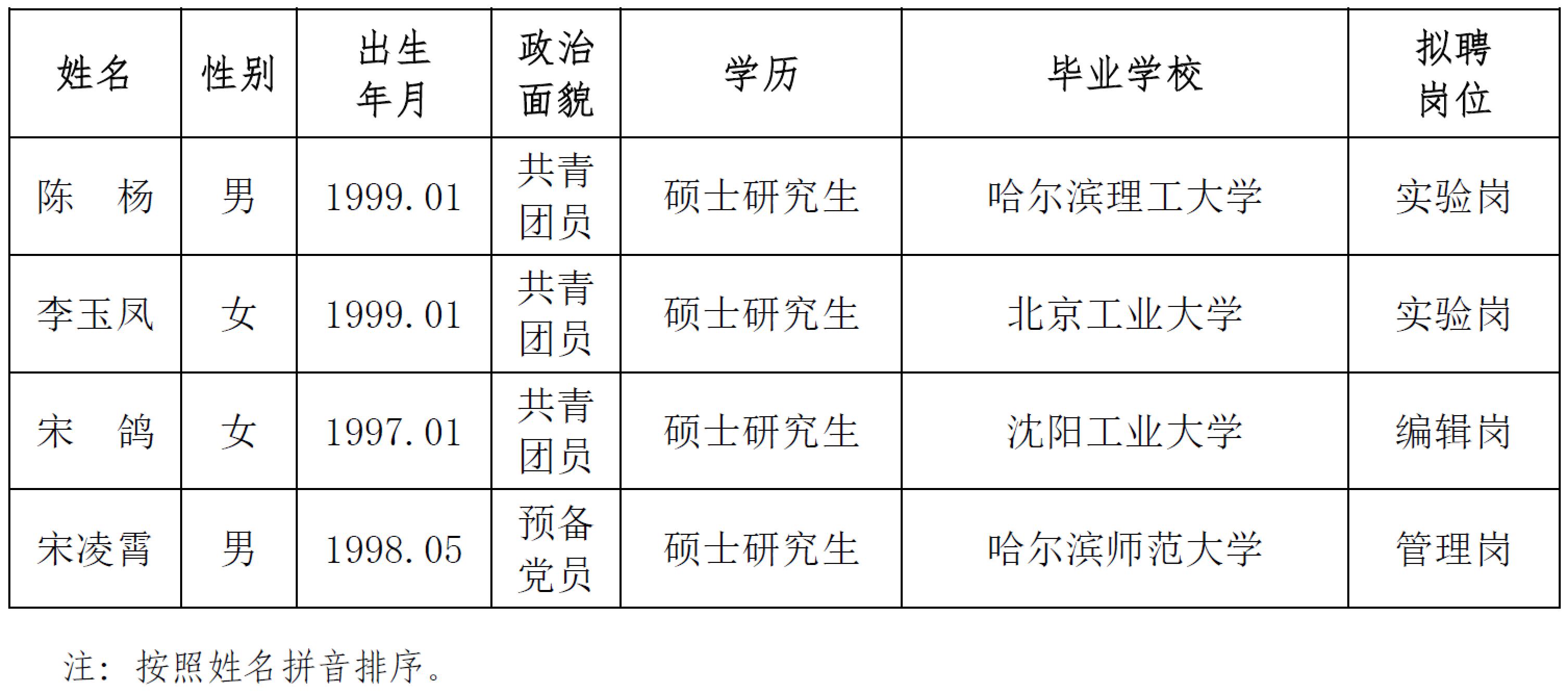 根據中國地震局《關于貫徹執行〈事業單位公開招聘人員暫行規定〉的通知》文件精神和我所用人計劃,經公開發布招聘信息、資格審查、面試等程序確定擬錄人員。現將擬錄人員相關情況公示如下,公示期7個工作日,期間如有異議請與中國地震局工程力學研究所人才資源部或紀檢室聯系,以個人名義反映情況的領署真實姓名,以單位名義反映情況的須加蓋公章。