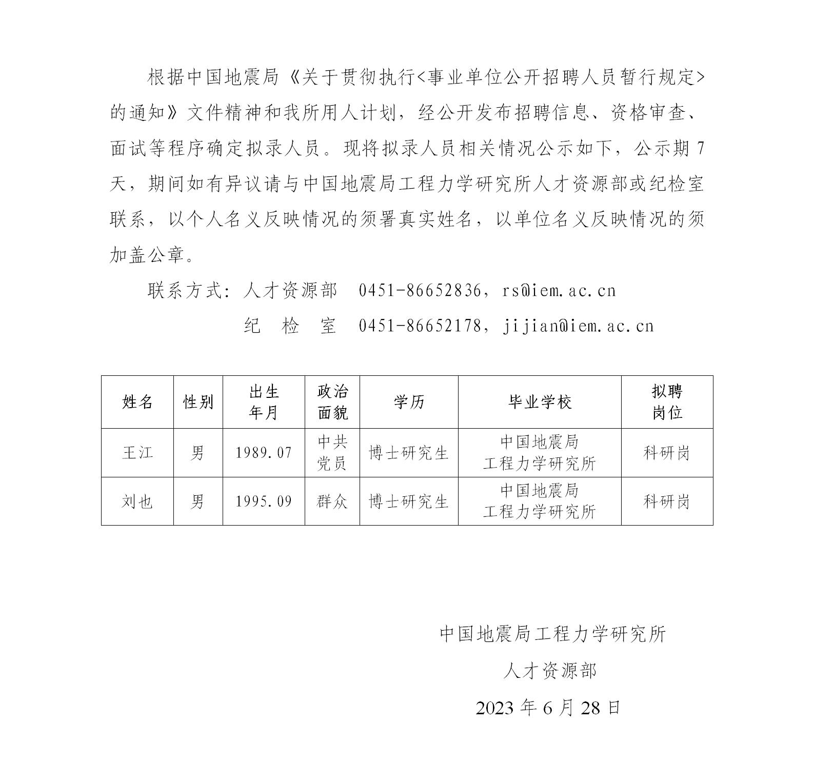 中國(guó)地震局工程力學(xué)研究所2023年擬錄用人員公示(二)