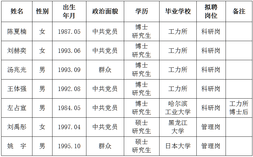 發(fā)布時間: 2022-05-30 點擊數(shù)量:6127根據(jù)中國地震局《關(guān)于貫徹執(zhí)行〈事業(yè)單位公開招聘人員暫行規(guī)定〉的通知》文件精神和我所用人計劃,經(jīng)公開發(fā)布招聘信息、資格審查、面試等程序確定擬錄人員。現(xiàn)將擬錄人員相關(guān)情況公示如下,公示期7天,期間如有異議請與中國地震局工程力學(xué)研究所人才資源部或紀(jì)檢室聯(lián)系,以個人名義反映情況的須署真實姓名,以單位名義反映情況的須加蓋公章。